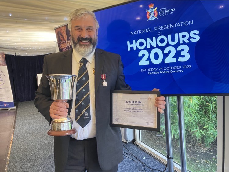 Pictures – Dean Baker – Club Chair – who attended the 2023 RLSS UK Honours presentation at Coventry to receive the Clive Holland Trophy from Clive personally.